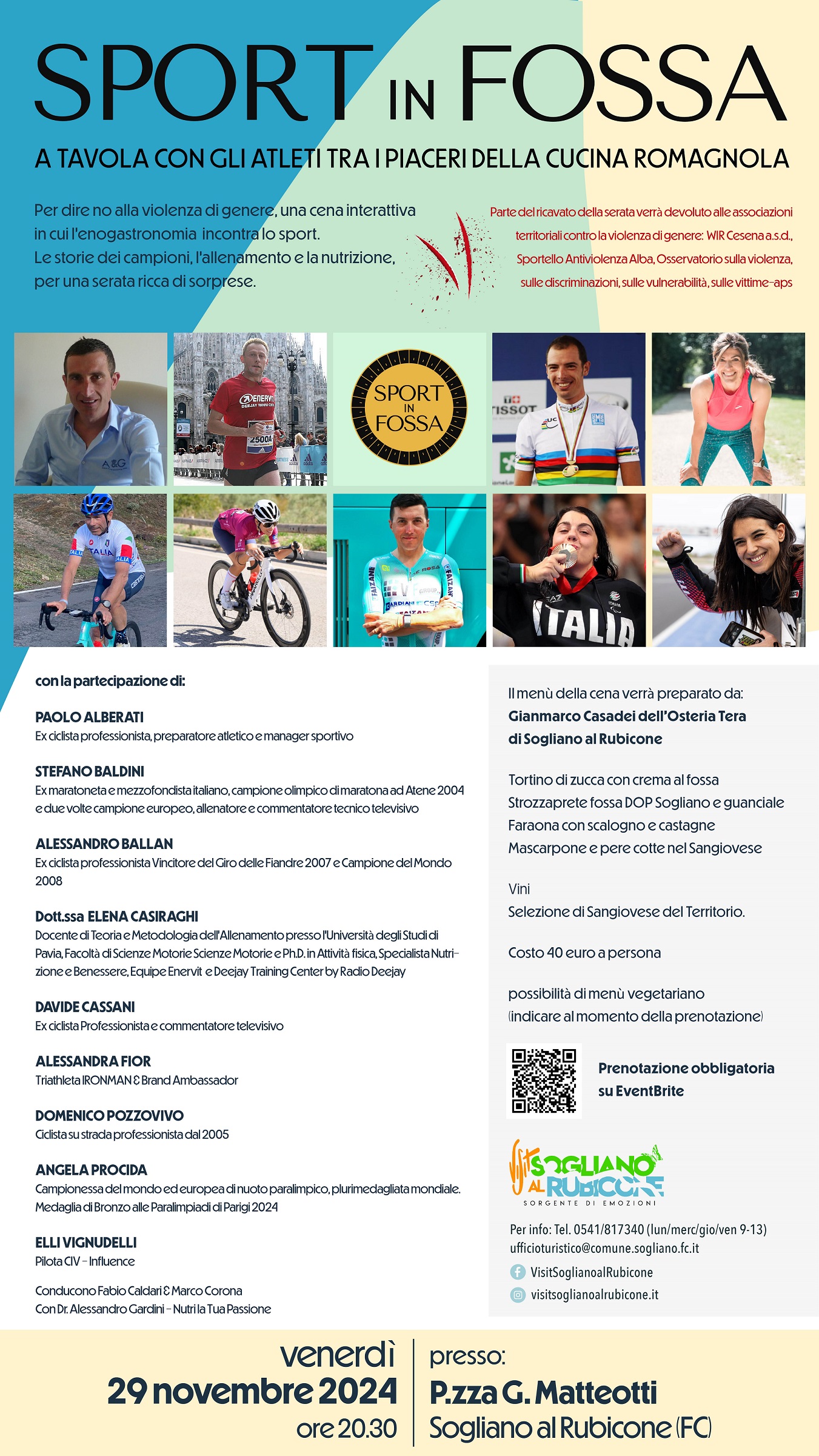 Per dire no alla violenza di genere, una cena interattiva in cui l’enogastronomia incontra lo sport. Le storie dei campioni, l’allenamento e la nutrizione, per una serata ricca di sorprese.